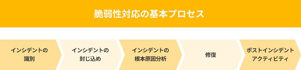 一方、脆弱性対応=インシデント対応(Incident Response)は、脆弱性が悪用された後のプロセスです。これはリアクティブ対応的なものであり、発生したインシデントに対処し、その影響を最小限に抑えることを目的としています。脆弱性対応は以下のステップで構成されます。