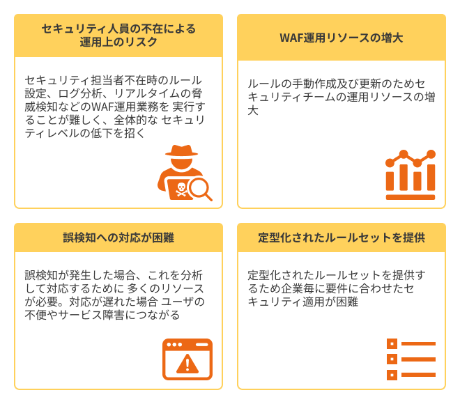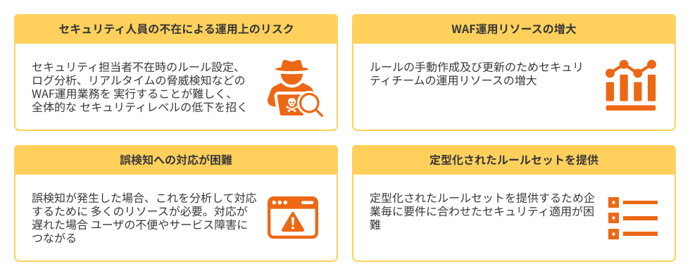しかし、これらネイティブWAFは、あらかじめ定義されたルールセットの提供やカスタマイズの制限により、企業ごとの多様なWebセキュリティ要件に柔軟に対応することが困難な状況にあります。