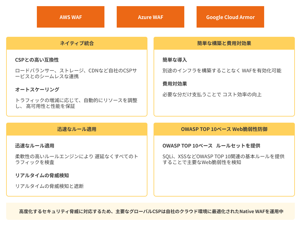 現在、多くの企業がAWS、Azure、GCPなどのCSP(クラウドサービスプロバイダ)が提供するネイティブWAF(Web Application Firewall)を活用して、Webアプリケーションの保護を行っています。