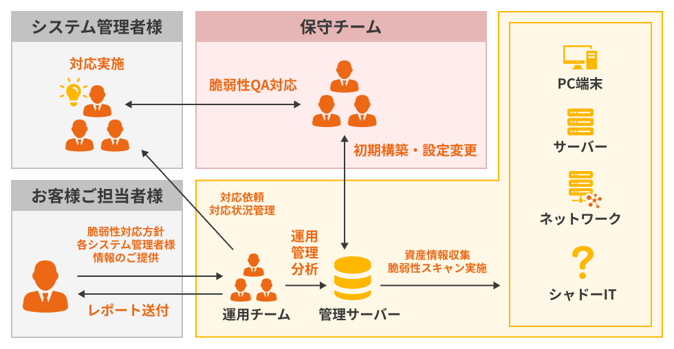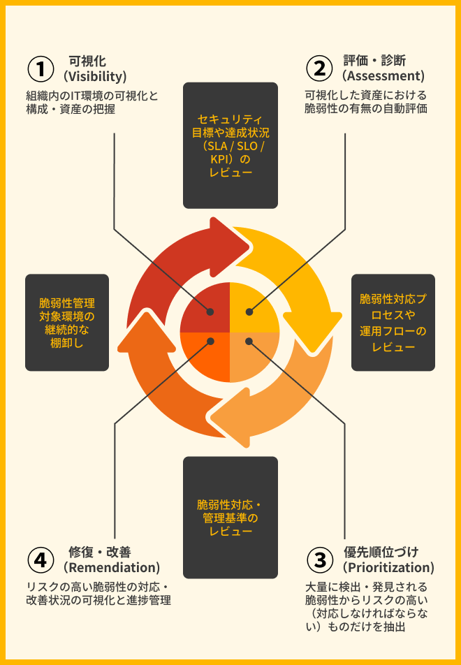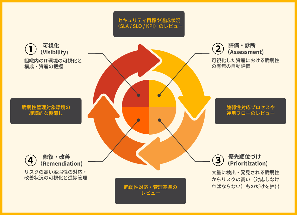 システムやネットワークに存在する脆弱性(セキュリティの穴)を定期的に特定・評価・修正し、再発を防止するための継続的なプロセスです。